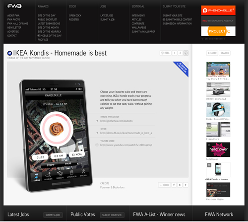 One of my favorite places to visit for inspiration is TheFWA (The Favorite Website Awards). TheFWA website is a great resource and collection of some of the best flash websites on the Internet. Although I don’t design flash sites, the visual design work alone is enough to create a spark. The inspiration most of the time comes from the small details rather than the overall look-n-feel of the sites. Some of the best ideas come from small widgets, buttons, arrows, boxes, shadow treatments, pop-up overlays, etc.